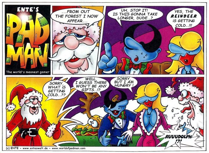 Meanwhile, ENTE had the opportunity to rummage in its WoP file archive and has compiled a total of 800 MB of material, which we are currently sifting through and will integrate bit by bit on our website in the course of the coming year. There is also a lot of picture material that will be of particular benefit to the restored WoP news. There will also be a few more downloads and a selection of Padman comics. We will start today with the very last Padman comic, which was published in Playstation Games magazine at that time. The Padman comics will be published in English for the first time. This is our Christmas present to you. Have fun with it!