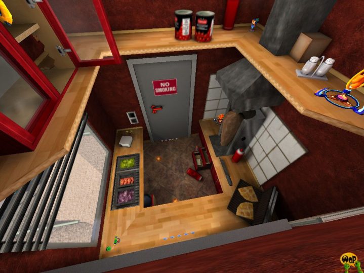 Place 1: So, now we come back to the winning map. Phobos was the only one, who built an over-sized map in the style of World of Padman. You are in a kitchen of a Döner (wrap) store. On the floor is a cabinet and a ketchup tube. On the cabinet is the kebab skewer and a lot of vegetables, to fill your wrap with. It is being grilled at the moment. At the top is a shelf with a BUBBLE G, a PadShield and a HealthStation. The other PadShield is in the cabinet on the floor. The fight concentrates on the floor and everyone is searching for the PadShield at the start, so the one who gets both is ahead.