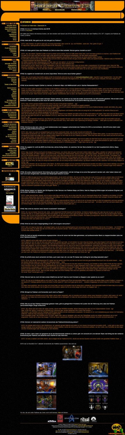 This very detailed interview by Jörg Dubiel (Deslizer) with ENTE is about the PadMod, the PadMaps, Elite Force 1 and 2, game engines and the Padman comics. Finally, seven screenshots from the early stages of PadMod and a Padman comic were shown. The original website where the interview was published is unfortunately no longer online and it is also no longer available via the web archive.